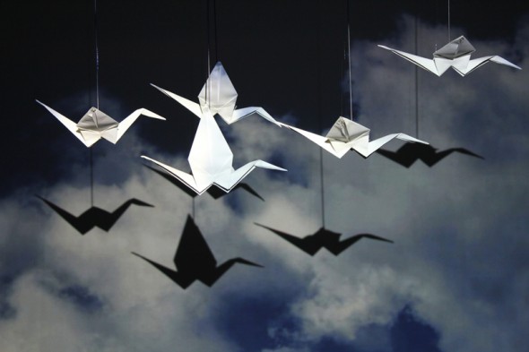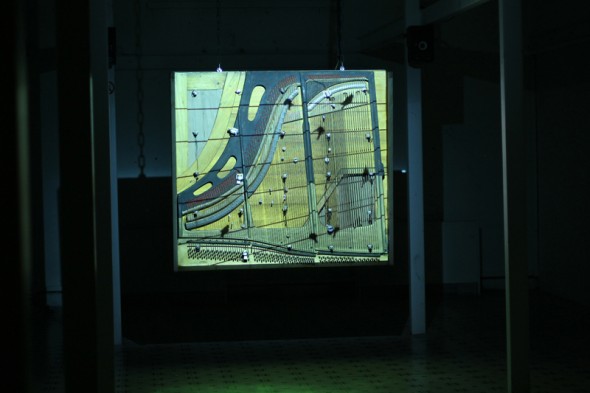 I have just finished taking part in the wonderful Almost Cinema festival in Ghent, Belgium. I exhibited the installations Piano Migrations and Dancing Cranes, the latter being a collaboration with the amazing Norwegian composer and vocalist Maja Ratkje. Both works were in the Snoepwinkel (and old Candy Store) next door to the main venue, Vooruit Arts Centre. It was a great space for the work. The front windows were blacked out with peep holes to see the cranes in order to entice people to enter. The back room has a very high ceiling and a fantastic structure of bars and pillars – perfect for hanging a piano amongst, the perspective of the pillars drawing the eye towards the piano.