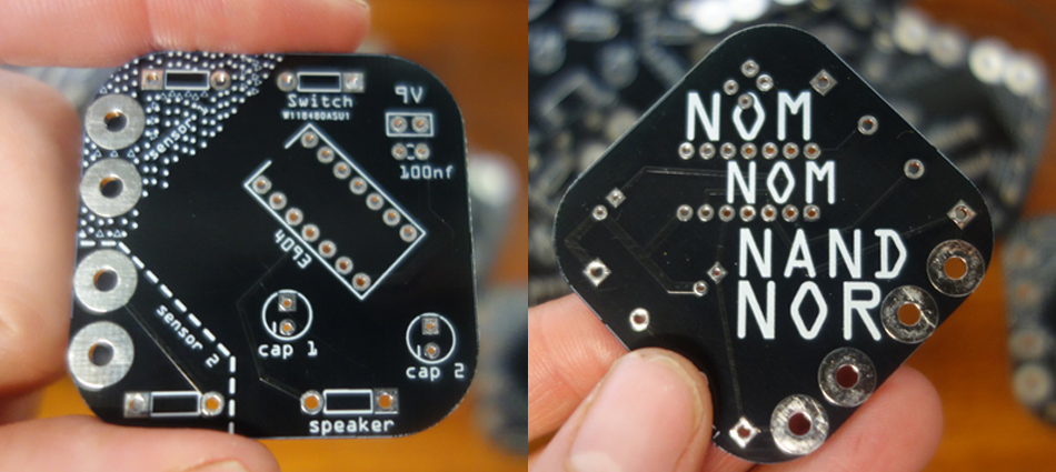 PRRRRRT design simple synths and run synth making workshops for all abilities incorporating soldering, e-texiles, sensors and more. Their first Synth is the NomNomNandNor 4 x Nand gate synth – more info here.