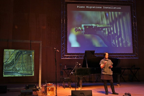 Just back from an amazingly inspiring event at Snape Maltings, Suffolk…. TEDx Aldeburgh, hosted by Thomas Dolby. I was invited to present in a programme of really fabulous speakers and performers – Jennifer Stumm, Akala, Vincent Walsh, Hannah Brock, Peter Gregson, Nitin Sawhney, and the Modified Toy Orchestra… superb. For my allotted 18 minutes (which created a healthy boundary to make sure I was concise) focused on my passion to combine visual art and music, my approach to using technology in this quest, and how the work I was showing referenced the ideas of graphic scores. I took along my Piano Migrations installation to demonstrate, and there was flutter of interest around the twitchr online project too…. see the video here.