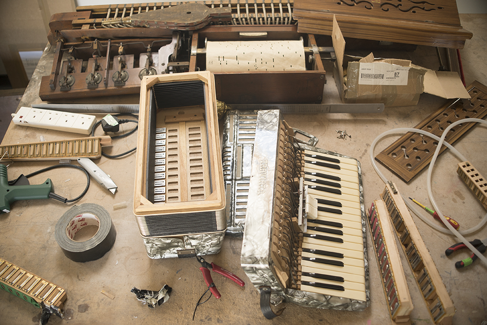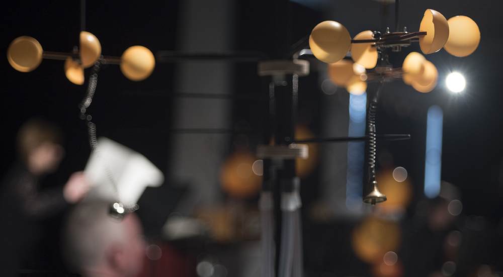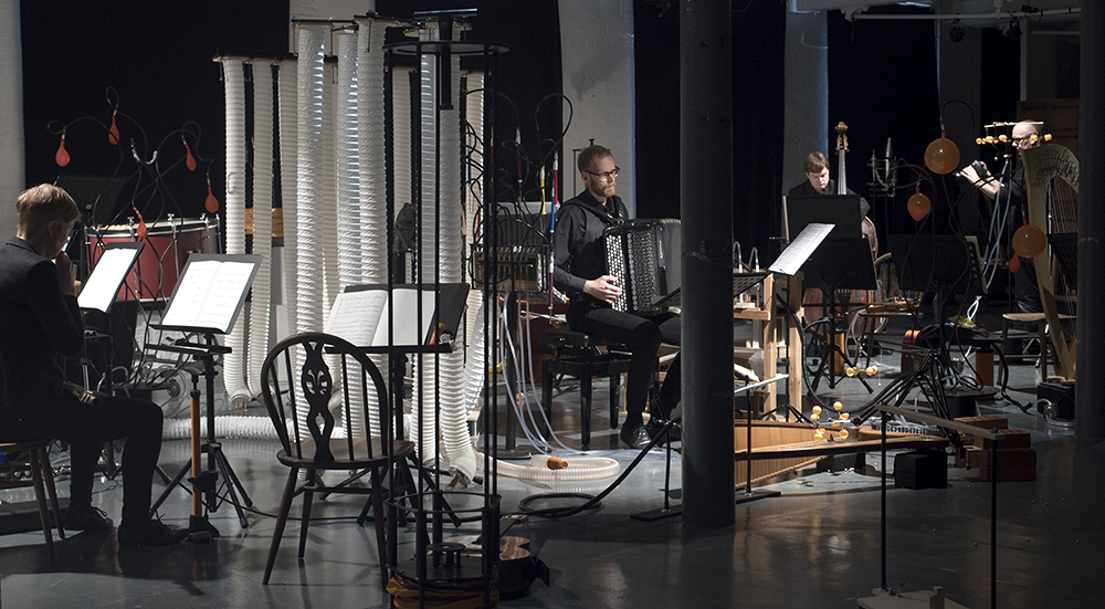The air-activated instruments are mechanically activated by the musicians during the piece, blending the sounds of the installation with the musicians’ conventional instruments in a composed, breathing entirety.