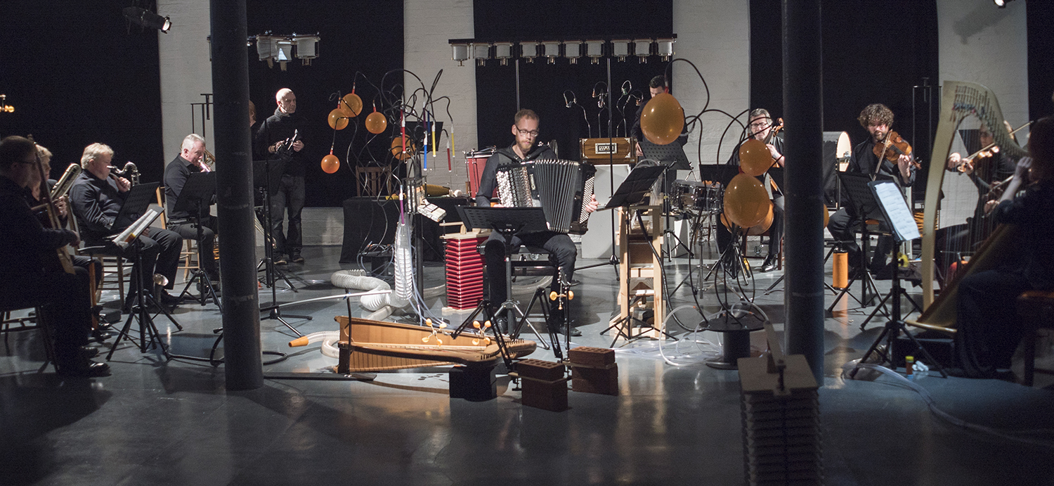 Aeolian draws its inspiration and title from the “breath” of the accordion. Ratkje and Hinde have collaborated closely on creating a hybrid piece where newly invented aeolian instruments are fully integrated within an acoustic ensemble. Accordion soloist Andreas Borregaard, is at the centre of the work both physically and musically.